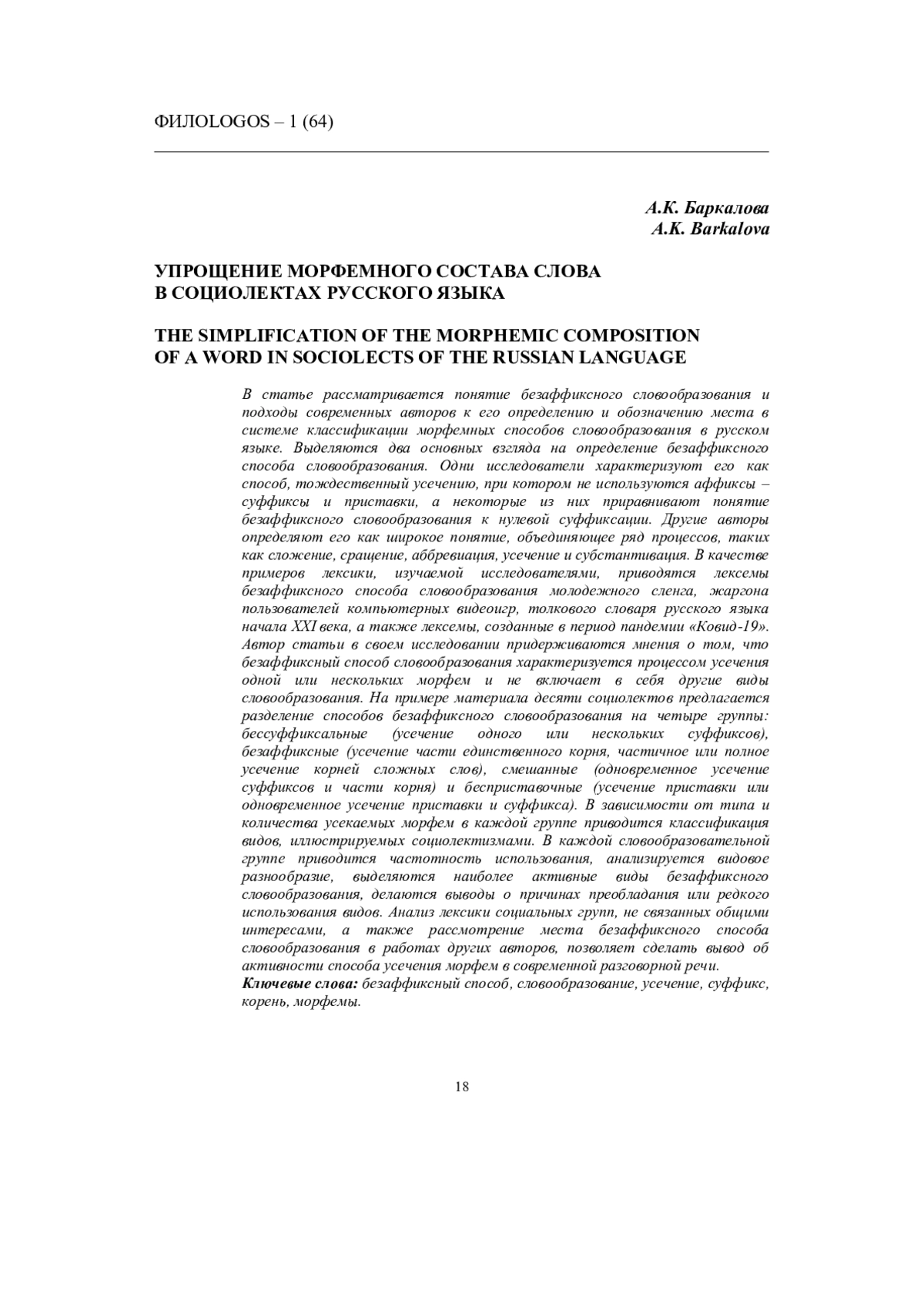 В статье рассматривается понятие безаффиксного словообразования и подходы современных авторов к его определению и обозначению места в системе классификации морфемных способов словообразования в русском языке. Выделяются два основных взгляда на определение безаффиксного способа словообразования. Одни исследователи характеризуют его как способ, тождественный усечению, при котором не используются аффиксы - суффиксы и приставки, а некоторые из них приравнивают понятие безаффиксного словообразования к нулевой суффиксации. Другие авторы определяют его как широкое понятие, объединяющее ряд процессов, таких как сложение, сращение, аббревиация, усечение и субстантивация. В качестве примеров лексики, изучаемой исследователями, приводятся лексемы безаффиксного способа словообразования молодежного сленга, жаргона пользователей компьютерных видеоигр, толкового словаря русского языка начала XXI века, а также лексемы, созданные в период пандемии «Ковид-19». Автор статьи в своем исследовании придерживаются мнения о том, что безаффиксный способ словообразования характеризуется процессом усечения одной или нескольких морфем и не включает в себя другие виды словообразования. На примере материала десяти социолектов предлагается разделение способов безаффиксного словообразования на четыре группы: бессуффиксальные (усечение одного или нескольких суффиксов), безаффиксные (усечение части единственного корня, частичное или полное усечение корней сложных слов), смешанные (одновременное усечение суффиксов и части корня) и бесприставочные (усечение приставки или одновременное усечение приставки и суффикса). В зависимости от типа и количества усекаемых морфем в каждой группе приводится классификация видов, иллюстрируемых социолектизмами. В каждой словообразовательной группе приводится частотность использования, анализируется видовое разнообразие, выделяются наиболее активные виды безаффиксного словообразования, делаются выводы о причинах преобладания или редкого использования видов. Анализ лексики социальных групп, не связанных общими интересами, а также рассмотрение места безаффиксного способа словообразования в работах других авторов, позволяет сделать вывод об активности способа усечения морфем в современной разговорной речи.