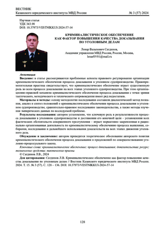Обсуждение и заключение: автором приводится теоретическое обоснование авторского понятия криминалистического обеспечения процесса доказывания и предложений по совершенствованию уголовно-процессуального закона.