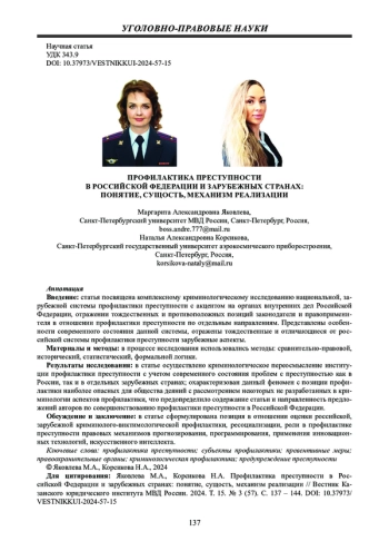 Результаты исследования: в статье осуществлено криминологическое переосмысление институции профилактики преступности с учетом современного состояния проблем с преступностью как в России, так и в отдельных зарубежных странах; охарактеризован данный феномен с позиции профилактики наиболее опасных для общества деяний с рассмотрением некоторых не разработанных в криминологии аспектов профилактики, что предопределило содержание статьи и направленность предложений авторов по совершенствованию профилактики преступности в Российской Федерации.