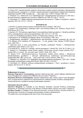 12. Кузьминых А.С. Общие проблемы предупреждения преступности // Право и государство: теория и практика. 2023. № 1 (217). С. 190-191.