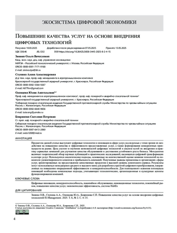Предметом данной статьи выступают цифровые технологии и инновации в сфере услуг, исследуемые с точки зрения их воздействия на повышение качества и эффективности предоставляемых услуг, а также формирования конкурентных преимуществ на рынке. Цель состоит в изучении возможностей цифровых технологий и анализе путей их внедрения в практику сервисных компаний для улучшения качества обслуживания и достижения устойчивого роста бизнеса. Методология включает теоретический обзор научных публикаций и практических исследований, касающихся цифровой трансформации в секторе услуг. Используются аналитические подходы, основанные на количественной оценке влияния технологий на показатели удовлетворенности клиентов и прибыльность компаний. Полученные выводы применимы в организациях сферы услуг, ориентированных на предоставление качественных продуктов и высокий уровень клиентского сервиса. Результаты могут использоваться менеджерами среднего и высшего звена для разработки стратегий цифрового преобразования, направленных на повышение операционной эффективности и конкурентоспособности. Для полноценного освоения потенциала инноваций необходимы комплексные подходы, учитывающие технологические, организационные и культурные аспекты функционирования компаний.