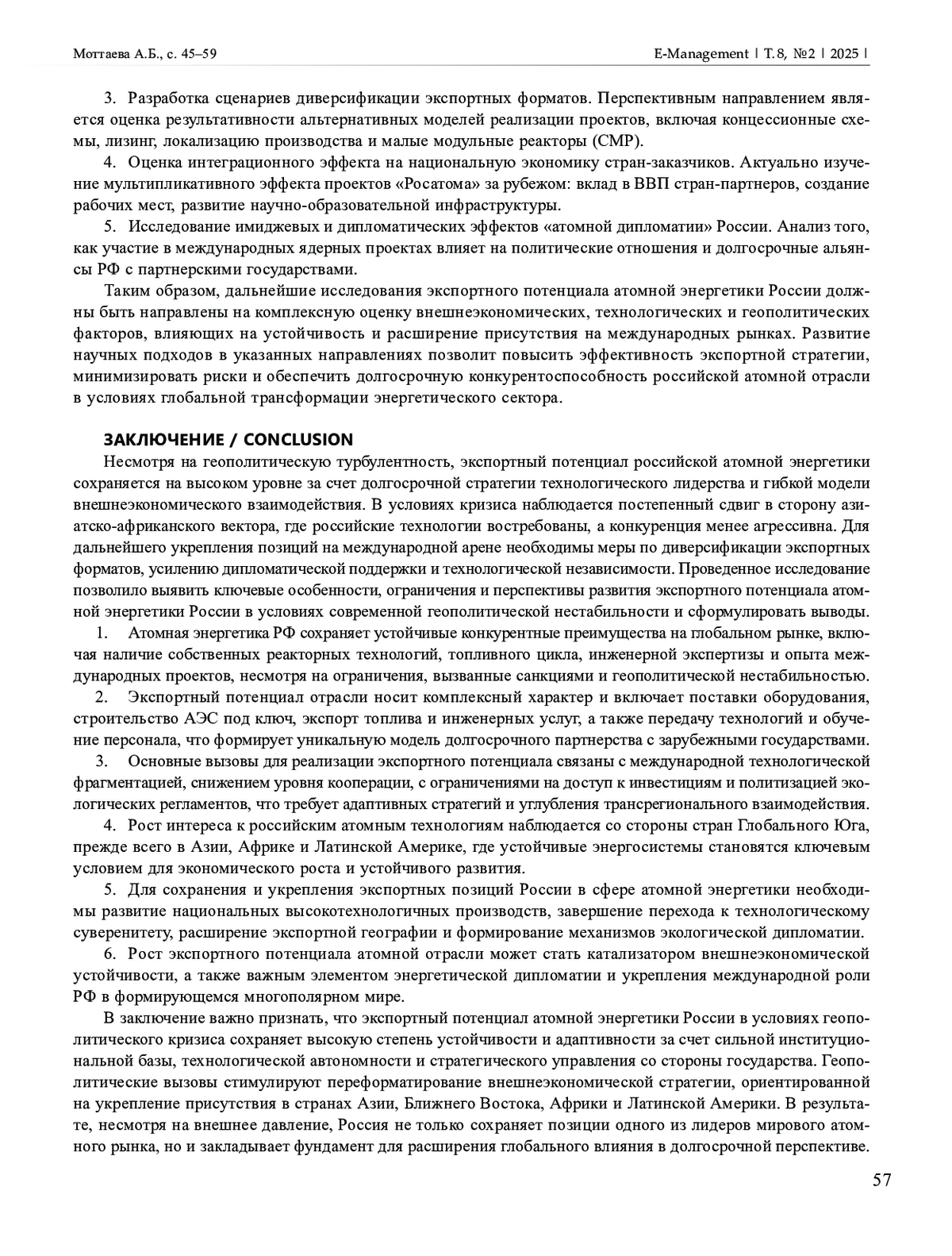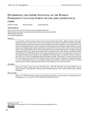 В последние десятилетия российская атомная промышленность активно осваивает внешние рынки, предлагая конкурентоспособные технологии, инфраструктурные решения и топливные услуги. В этом контексте целями исследования являются комплексное обоснование и практическая оценка экспортного потенциала атомной энергетики Российской Федерации (далее – РФ, Россия) в условиях усиления геополитического кризиса с учетом трансформации международной энергетической архитектуры, ограничений санкционного характера и изменения моделей глобального сотрудничества в ядерной сфере. Актуальность исследования заключается в том, что в условиях нарастающего геополитического напряжения атомная энергетика, являясь одним из наиболее наукоемких и высокотехнологичных сегментов отечественной экономики, обладает уникальным экспортным потенциалом, который проявляется не только в строительстве атомных электростанций (далее – АЭС) за рубежом, но и в поставках технологий, топлива, сервисов и компетенций. Тема охватывает стратегически важную задачу – определение роли и потенциала атомной энергетики как инструмента внешнеэкономической политики России и источника укрепления национального технологического суверенитета. Исследование направлено на оценку текущего состояния экспортных возможностей РФ в области строительства АЭС за рубежом, поставок ядерного топлива, технологий и инженерных решений, а также на разработку стратегических направлений устойчивого развития отрасли в условиях ограниченного доступа к западным рынкам и необходимости переориентации на партнерство с государствами Азии, Ближнего Востока, Африки и Латинской Америки.