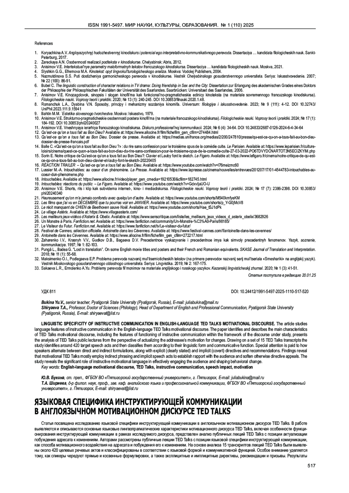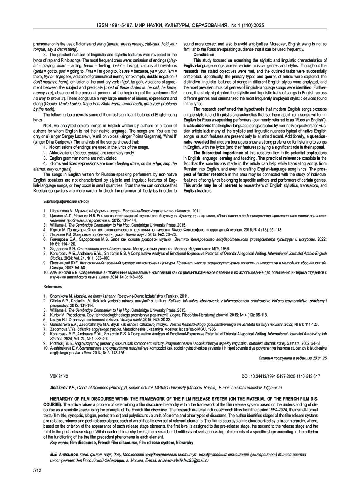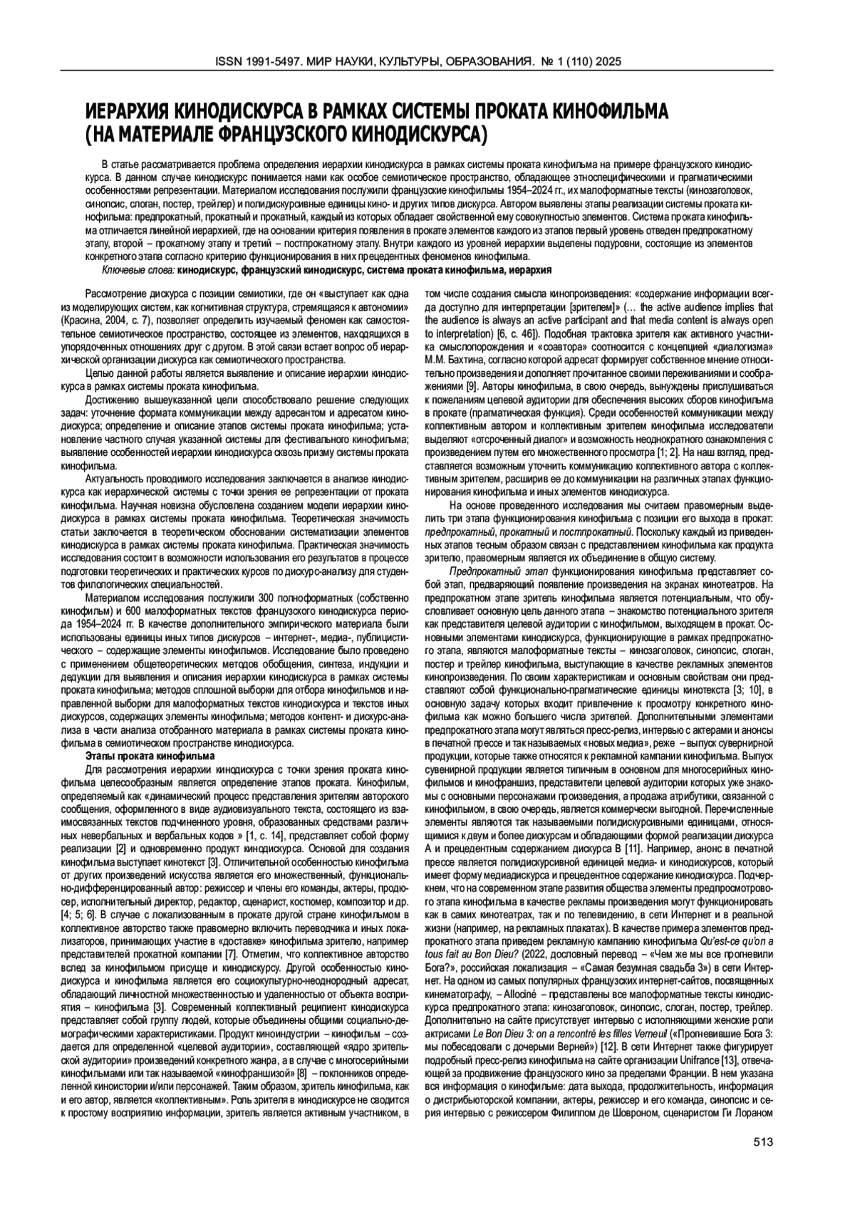 11. Анисимов В.Е. Внешняя иерархия французского кинодискурса. Дискурс профессиональной коммуникации. 2024; № 6 (4): 34-64. DOI: 10.24833/2687-0126-2024-6-4-34-64 EDN: BMPNXA