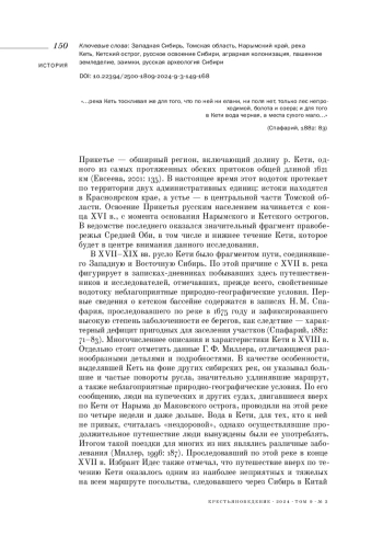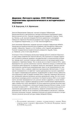 Статья посвящена начальному периоду русского освоения Нарымского края (север современной Томской области). Эта огромная по площади территория отличается суровыми природно-географическими и климатическими условиями, прежде всего, высокой степенью заболоченности (в настоящее время район приравнен к Крайнему Северу). Тем не менее уже во второй половине XVII в. здесь формируется сеть русских населенных пунктов, обитатели которых в хозяйственном отношении ориентировались на ведение пашенного земледелия. Данные селения располагались компактными микрорайонами. Один из них сформировался в нижнем течении р. Кеть, в районе, известном под названием «Кетский кряж». С точки зрения геоморфологии это фрагмент хорошо дренированных высоких надпойменных террас и водораздельной равнины, выделяющийся на фоне сплошь заболоченного Нарымского края. В первой половине XVII в. сюда был перенесен Кетский острог, являвшийся административным центром одноименного уезда. Он стал точкой притяжения земледельческого населения. Со второй половины XVII в. в его окрестностях начинает формироваться сеть русских заимок и деревень, а также появляются первые пашни. Суровые природные условия способствовали формированию здесь самобытного очага земледелия. В статье выявляются русские сельские населенные пункты, основанные в начальный период освоения Кетского кряжа, то есть во второй половине XVII - начале XVIII в. В качестве источников используются исторические картографические материалы, сведения путешественников и исследователей XVII-XVIII вв. На их основании устанавливаются связанные с первыми русскими селениями локации, имеющие потенциал для археологического и исторического изучения сельской культуры севера Западной Сибири.