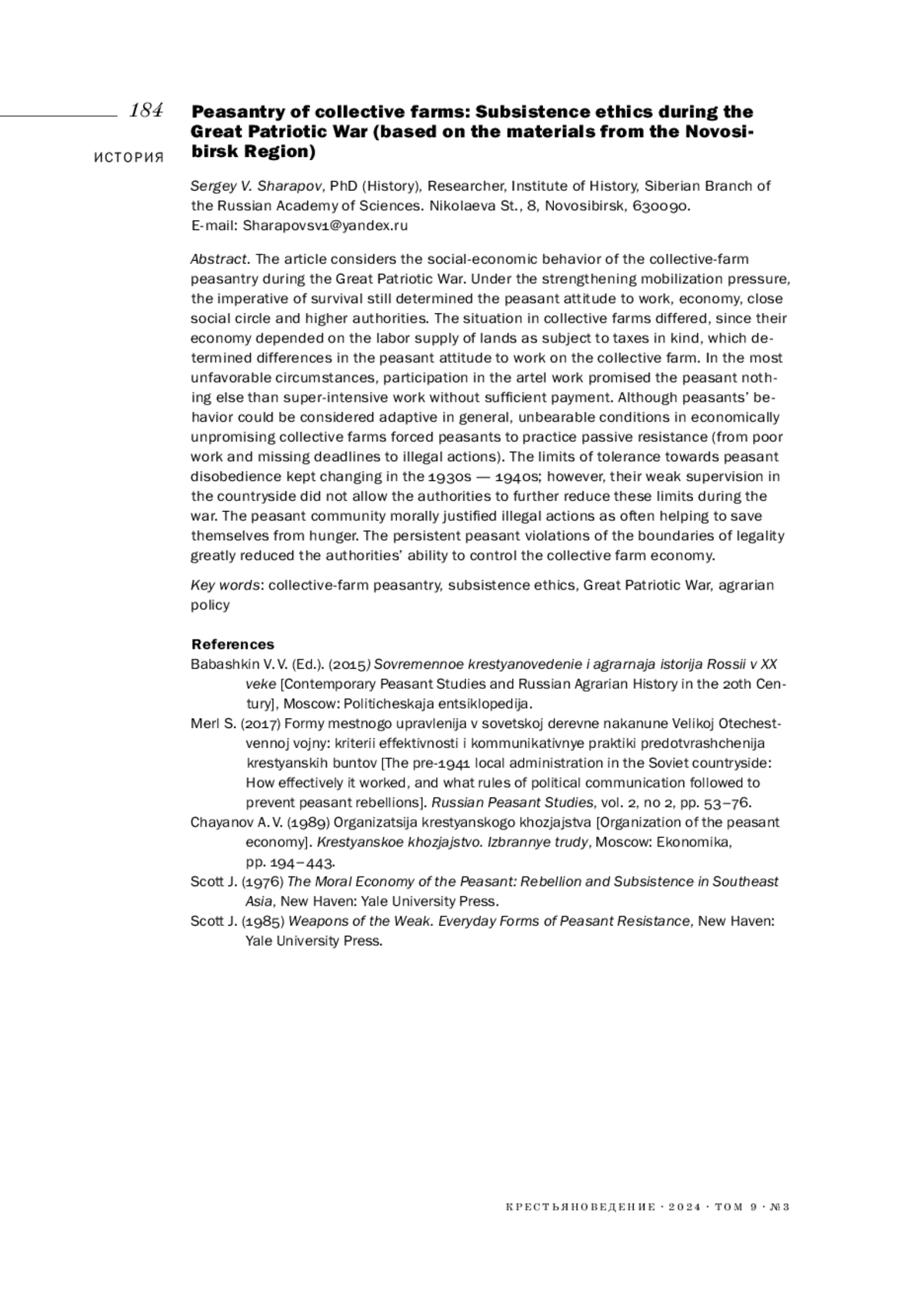 2. Мерль Ш. (2017). Формы местного управления в советской деревне накануне Великой Отечественной войны: критерии эффективности и коммуникативные практики предотвращения крестьянских бунтов // Крестьяноведение. Т. 2. № 2. С. 53-76. EDN: ZCINFB