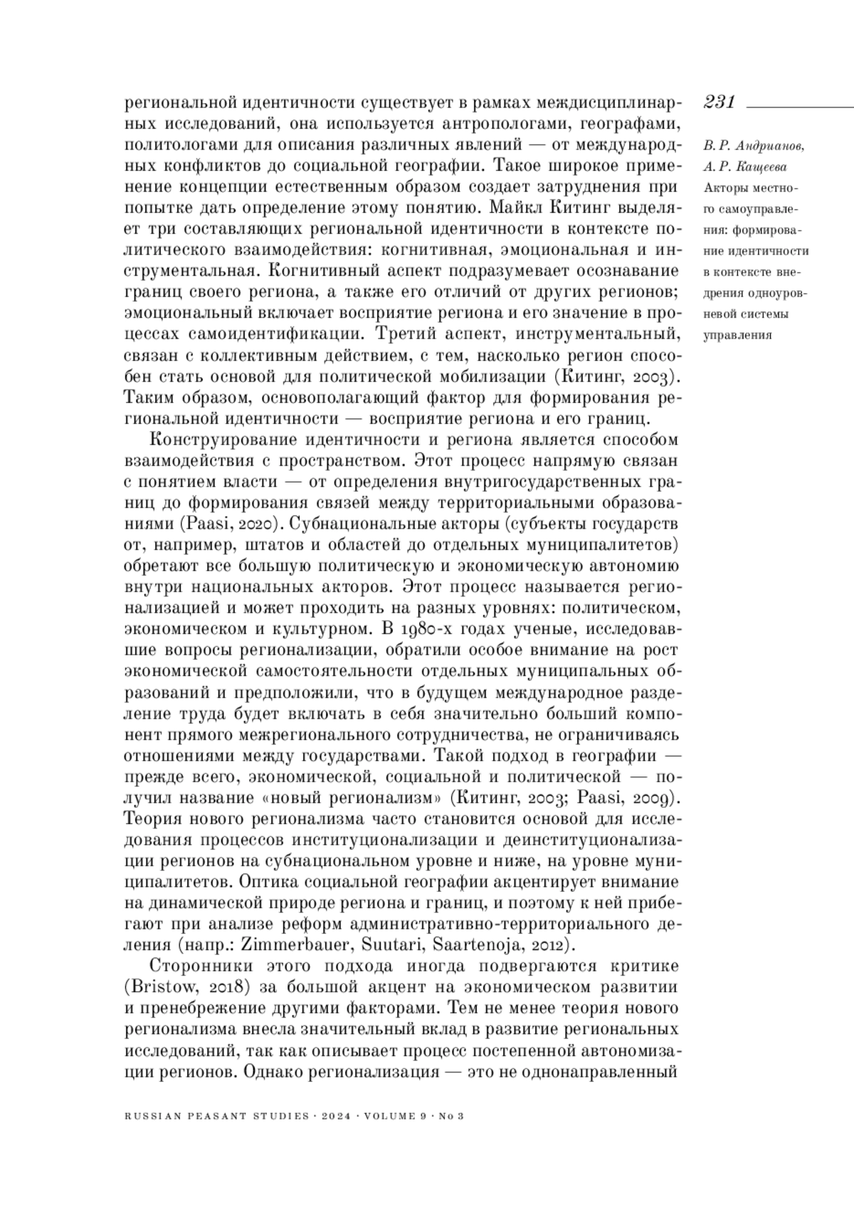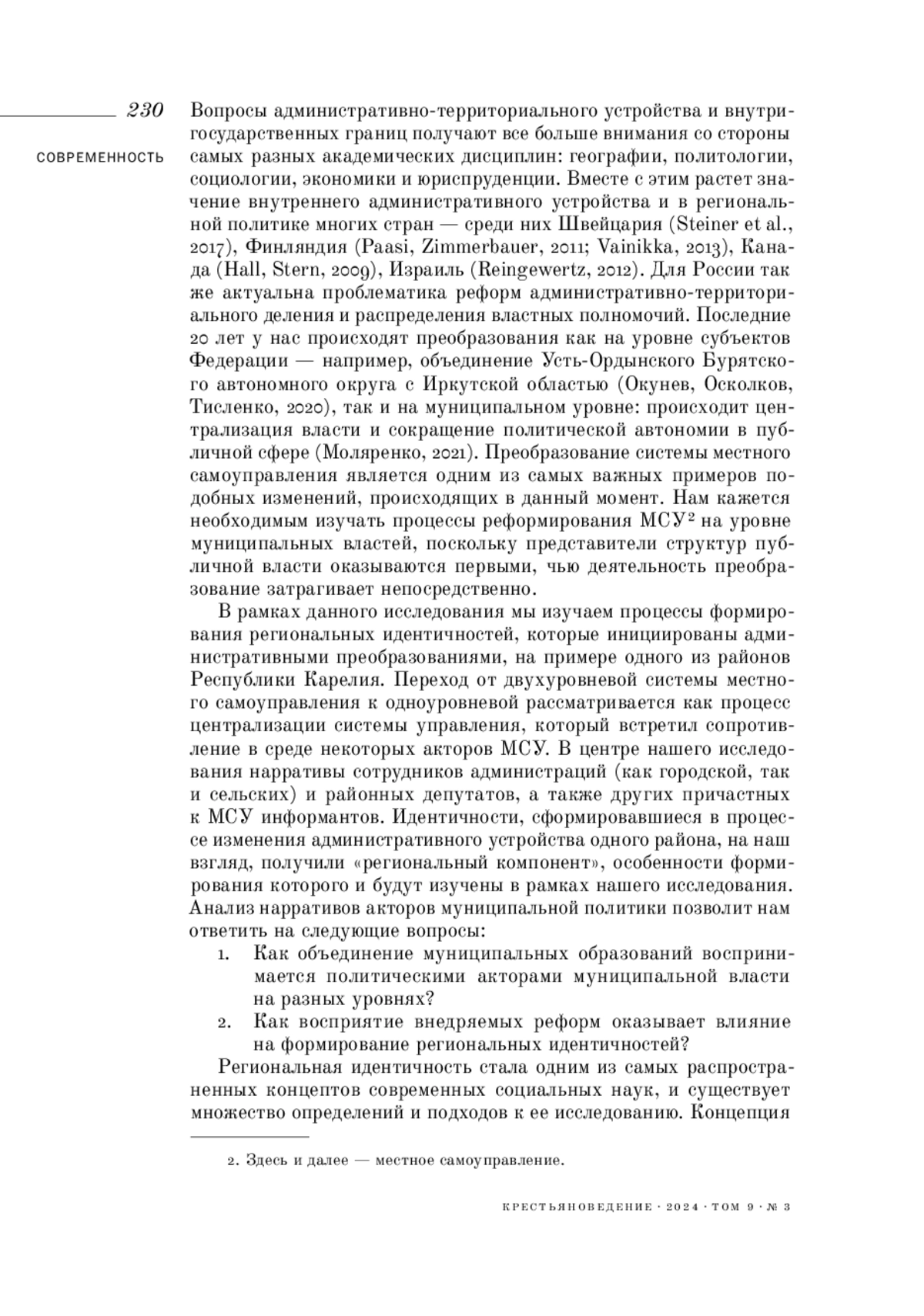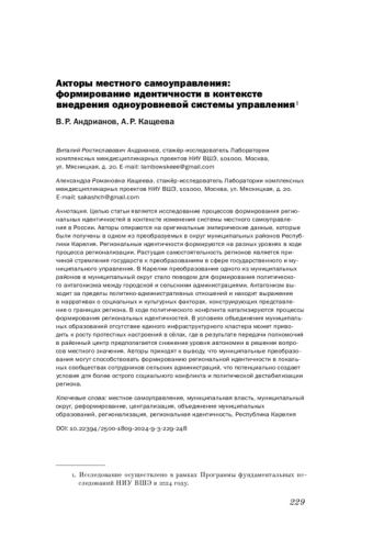 АНДРИАНОВ В. Р., КАЩЕЕВА А. Р. АКТОРЫ МЕСТНОГО САМОУПРАВЛЕНИЯ: ФОРМИРОВАНИЕ ИДЕНТИЧНОСТИ В КОНТЕКСТЕ ВНЕДРЕНИЯ ОДНОУРОВНЕВОЙ СИСТЕМЫ УПРАВЛЕНИЯ // КРЕСТЬЯНОВЕДЕНИЕ. 2024. Т. 9 № 3
