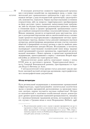 Процесс индустриализации Северо-Восточной Италии и, в частности, Северной Венецианской равнины шел вне городских центров, на аграрных территориях, для которых исторически было характерно землепользование, основанное на гармоничном сосуществовании различных культур в рамках отдельных мелких землевладений. Данная статья посвящена ключевым сдвигам, провоцирующим широкое распространение индустриальной деятельности на сельской территории и активное участие сельского населения в промышленном производстве. Материал статьи организован следующим образом: в первом разделе анализируется научная литература о путях региональной модернизации; во втором разделе представлены основные черты традиционного сельского хозяйства Северо-Восточной Венецианской равнины; в третьем рассматриваются изменения в отраслевой структуре местной экономики в период индустриализации. В заключении подводятся итоги и описываются текущие преобразования в местной экономике, обществе и ландшафте.