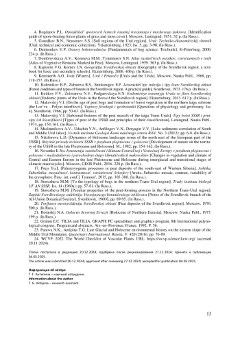 12. Маковский В.И. О возрасте торфяников и формировании лесной растительности в подзоне северной тайги (междуречье Лозьвы и Пелыма) // Вопросы физиологии и геоботаники. Свердловск, 1966. Вып. 4. С. 53-63.