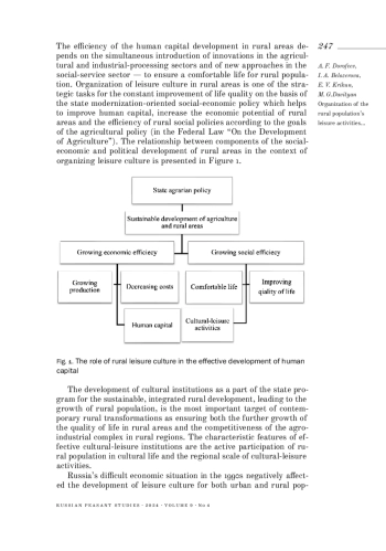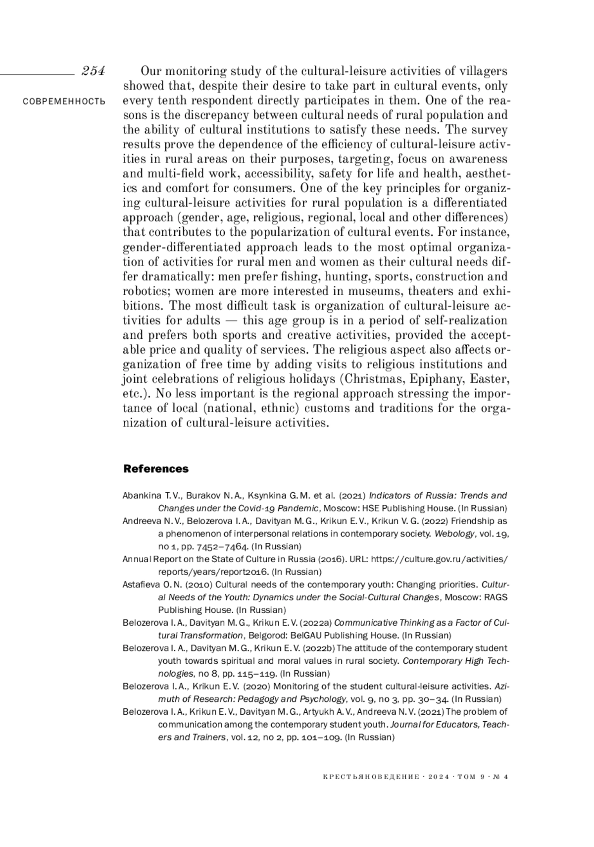 ДОРОФЕЕВ А. Ф., БЕЛОЗЕРОВА И. А., КРИКУН Е. В., ДАВИТЯН М. Г. ORGANIZATION OF THE RURAL POPULATION'S LEISURE ACTIVITIES AS A FACTOR OF PRESERVATION AND DEVELOPMENT OF THE RURAL HUMAN CAPITAL // КРЕСТЬЯНОВЕДЕНИЕ. 2024. Т. 9 № 4