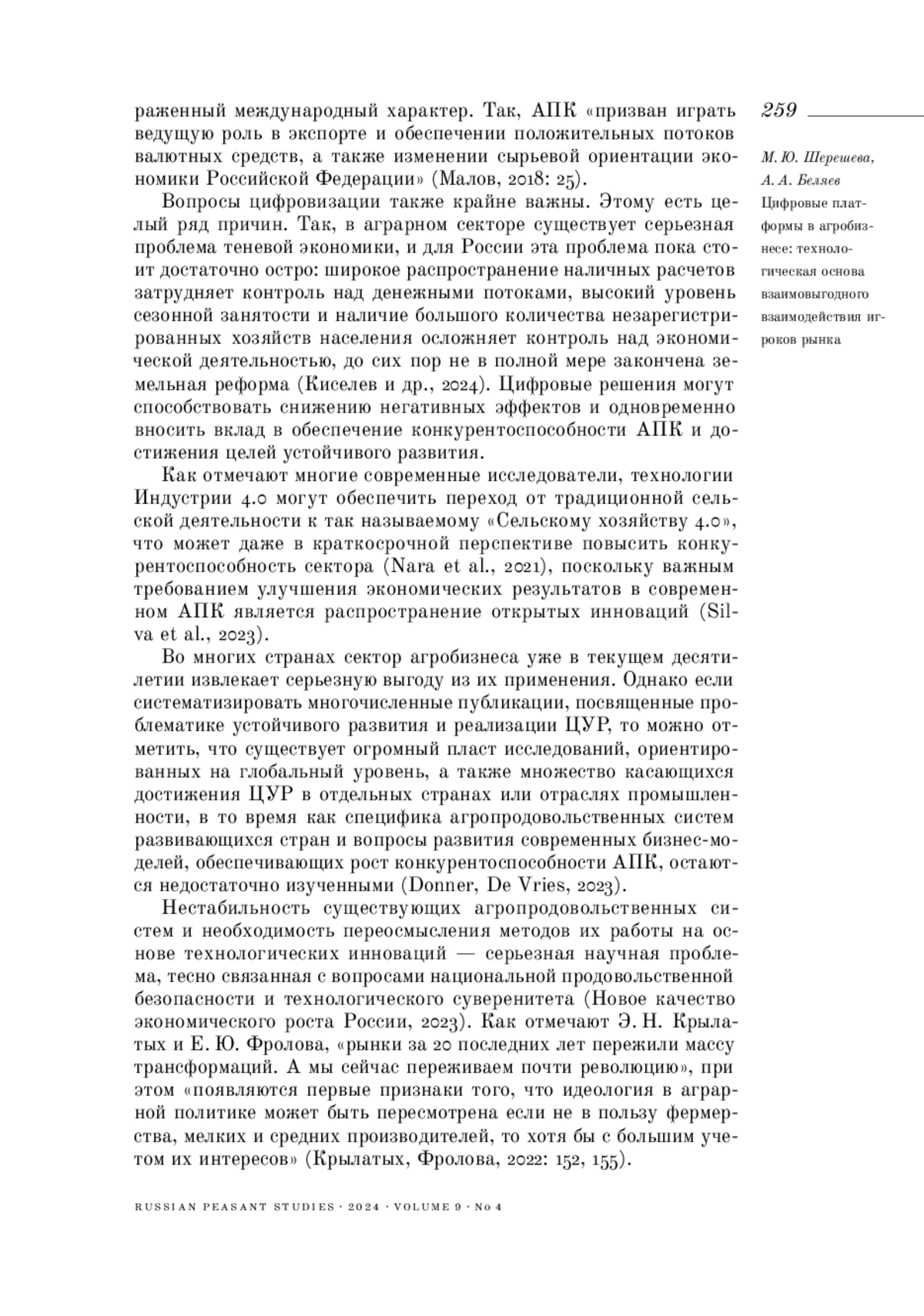 8. Крылатых Э. Н., Фролова Е. Ю. (2022). О книге В. Ф. Башмачникова с соратниками и единомышленниками “Фермерство семейного типа: потенциал, практика развития” // Крестьяноведение. Т. 7. № 4. С. 148-164. EDN: YCUMWM