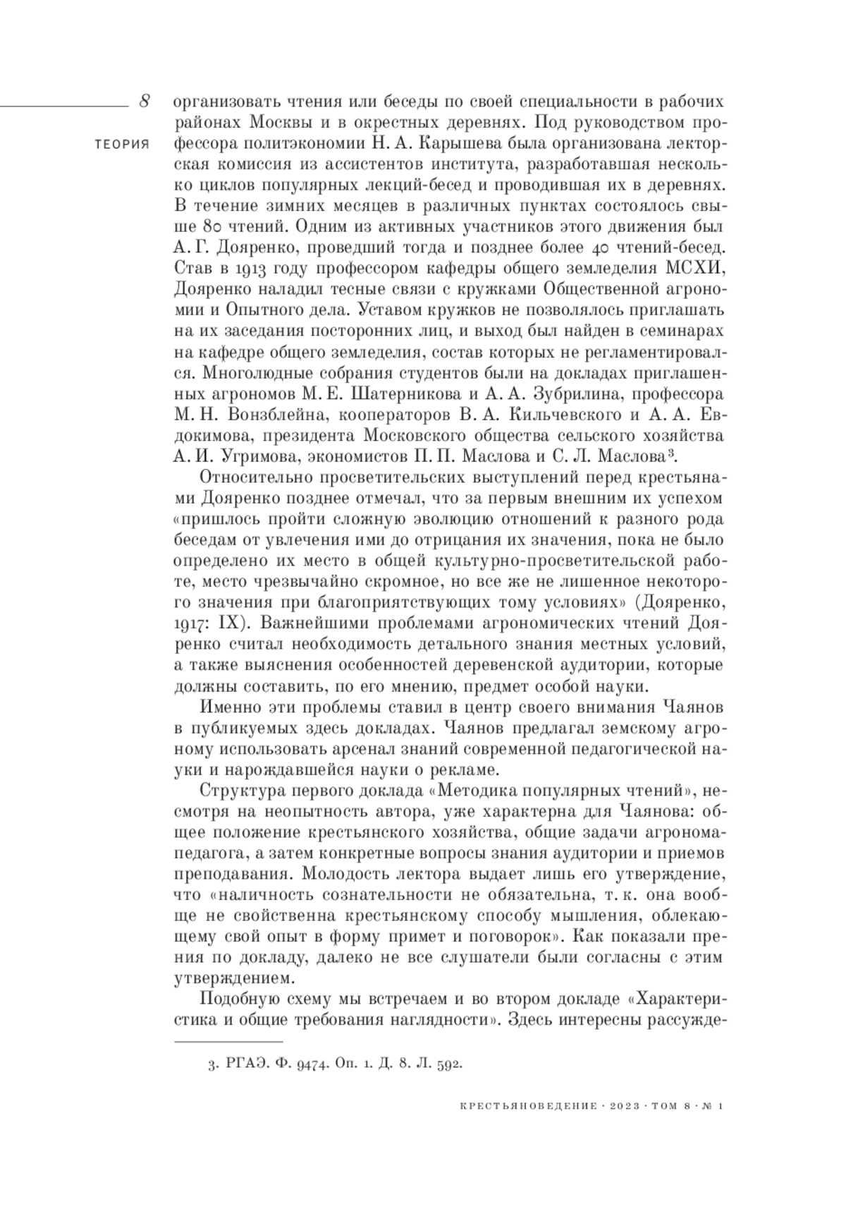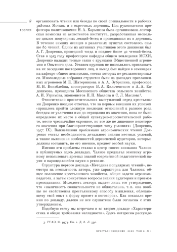 В публикации представлены два доклада А. В. Чаянова дореволюционного периода, представляющие собой его доклады на мероприятиях Кружка общественной агрономии при Московском сельскохозяйственном институте (МСХИ): «Методика популярных чтений» (23 октября 1914 года), «Характеристика и общие требования наглядности» (12 марта 1915 года), а также протокол прений по первому докладу. Впервые эти тексты были опубликованы в малотиражном сборнике, который сегодня является библиографической редкостью. Тексты отражают представления ученого о методологии работы по распространению агрономических знаний в крестьянской среде и являются основой одной из глав монографии «Основные идеи и методы работы общественной агрономии».