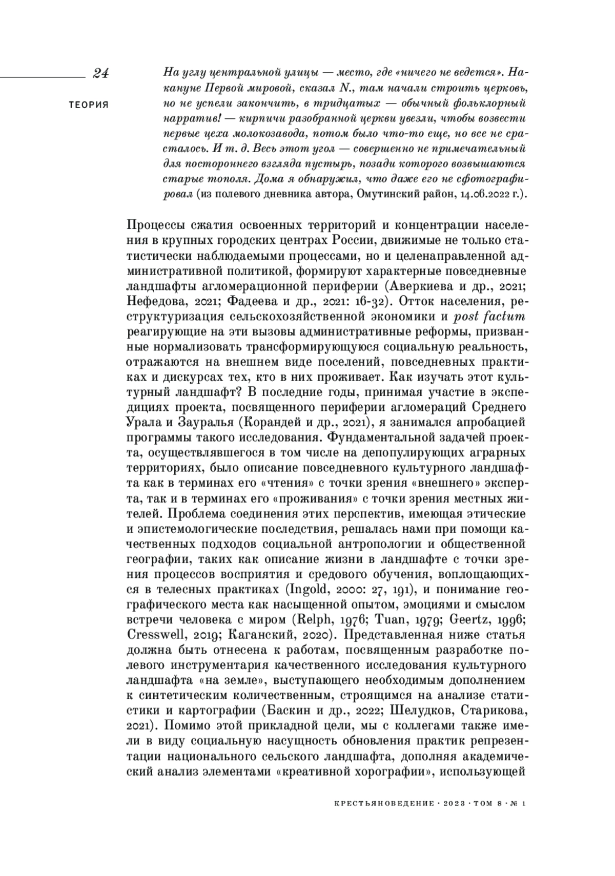 КОРАНДЕЙ Ф. С. ДЕРЕВЕНСКИЕ ПУСТЫРИ: МЕСТА СОПРИЧАСТНОСТИ И КАРТОГРАФИЯ "ПРИЗРАКОВ" ЛАНДШАФТА СЕЛЬСКОЙ ДЕПОПУЛЯЦИИ // КРЕСТЬЯНОВЕДЕНИЕ. 2023. Т. 8 № 1