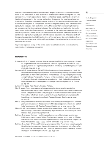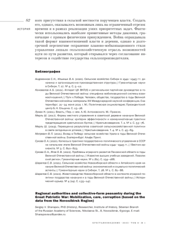 ШАРАПОВ С. В. РЕГИОНАЛЬНАЯ ВЛАСТЬ И КОЛХОЗНОЕ КРЕСТЬЯНСТВО В ГОДЫ ВЕЛИКОЙ ОТЕЧЕСТВЕННОЙ ВОЙНЫ: МОБИЛИЗАЦИЯ, ПОПЕЧЕНИЕ, КОРРУПЦИЯ (ПО МАТЕРИАЛАМ НОВОСИБИРСКОЙ ОБЛАСТИ) // КРЕСТЬЯНОВЕДЕНИЕ. 2023. Т. 8 № 1