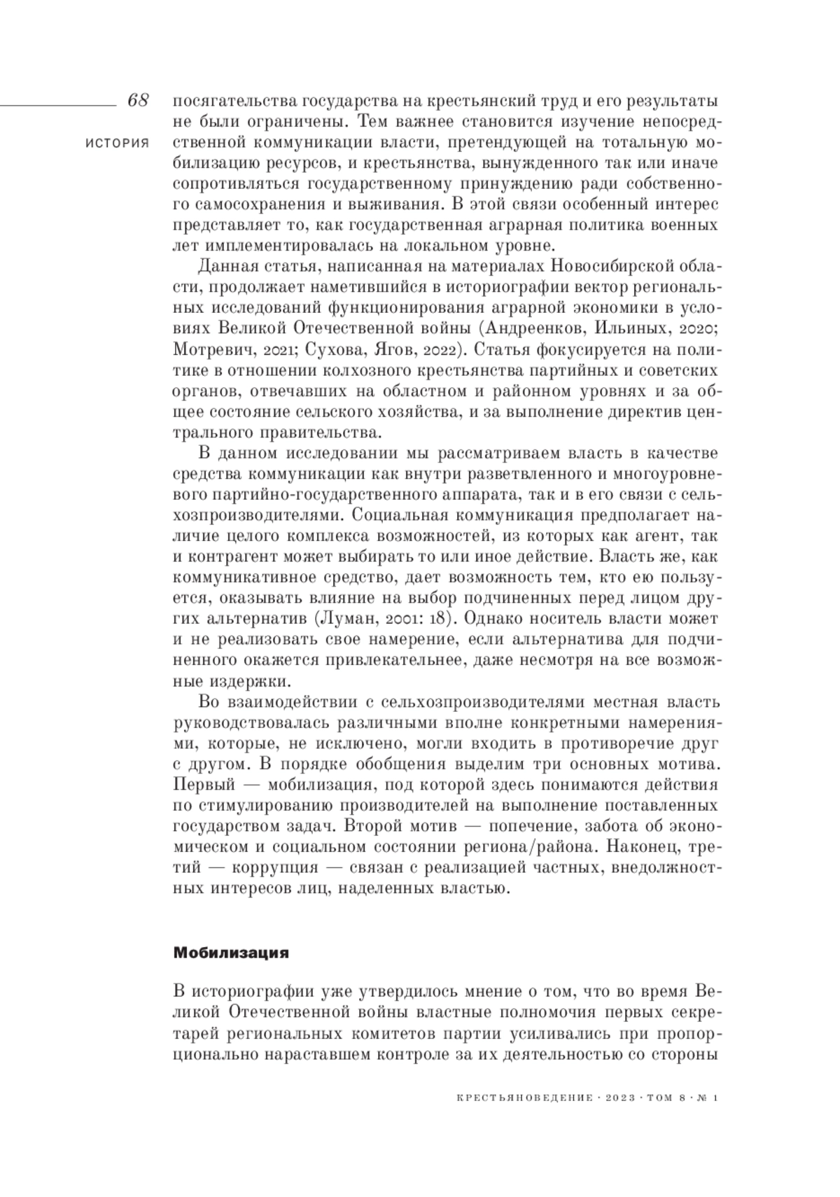 Статья: РЕГИОНАЛЬНАЯ ВЛАСТЬ И КОЛХОЗНОЕ КРЕСТЬЯНСТВО В ГОДЫ ВЕЛИКОЙ ОТЕЧЕСТВЕННОЙ ВОЙНЫ: МОБИЛИЗАЦИЯ, ПОПЕЧЕНИЕ, КОРРУПЦИЯ (ПО МАТЕРИАЛАМ НОВОСИБИРСКОЙ ОБЛАСТИ) (2024)