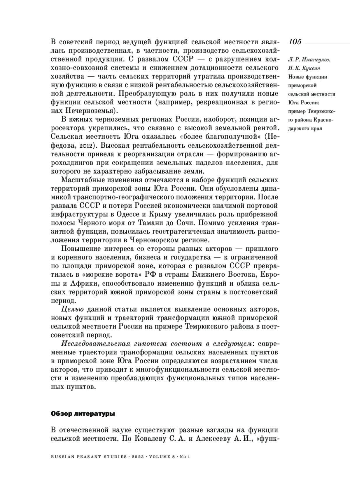 В статье рассмотрены новые функции приморской сельской местности Юга России в постсоветский период. Обозначены региональные особенности постсоветской трансформации приморской сельской местности, среди которых сохранение аграрной специализации и занятости, рост численности сельского населения, появление новых функций сельской местности, положительный миграционный баланс территории и т. д. На основе динамики доступных социально-экономических показателей (инвестиции в основной капитал, численность населения, миграционный прирост и т. д.) обозначены масштабы интенсивности трансформационных процессов на уровне района, сельских поселений и населенных пунктов. Выявлены ведущие социально-экономические акторы преобразования сельской местности: агропредприятия (винодельческие хозяйства), туризм, «новые южане», портовое хозяйство и др. Проведена оценка их влияния на основные компоненты сельской местности - землепользование, транспортную и социальную инфраструктуру, занятость населения и локальные сообщества. На внутрирайонном уровне представлена типология сельских поселений в соответствии с динамикой трансформационных процессов в постсоветский период и преобладающие функциональные типы сельских населенных пунктов («агропромышленный», «рекреационный», «полифункциональный»). В заключительной части с использованием выдержек из глубинных интервью детально описаны постсоветские траектории трансформации сельских населенных пунктов одного рода и административного статуса, но с разным функциональным типом и географическим положением - Голубицкой, Старотитаровской и Тамани. На основании полимасштабного анализа трансформации сельской местности выявлена ведущая роль фактора географического положения населенного пункта/территории в функциях сельской местности.