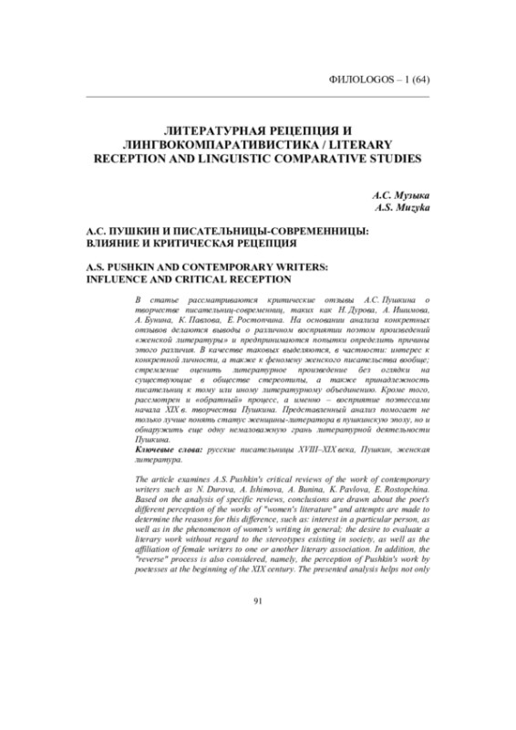 В статье рассматриваются критические отзывы А. С. Пушкина о творчестве писательниц-современниц, таких как Н. Дурова, А. Ишимова, А. Бунина, К. Павлова, Е. Ростопчина. На основании анализа конкретных отзывов делаются выводы о различном восприятии поэтом произведений «женской литературы» и предпринимаются попытки определить причины этого различия. В качестве таковых выделяются, в частности: интерес к конкретной личности, а также к феномену женского писательства вообще; стремление оценить литературное произведение без оглядки на существующие в обществе стереотипы, а также принадлежность писательниц к тому или иному литературному объединению. Кроме того, рассмотрен и «обратный» процесс, а именно - восприятие поэтессами начала XIX в. творчества Пушкина. Представленный анализ помогает не только лучше понять статус женщины-литератора в пушкинскую эпоху, но и обнаружить еще одну немаловажную грань литературной деятельности Пушкина.