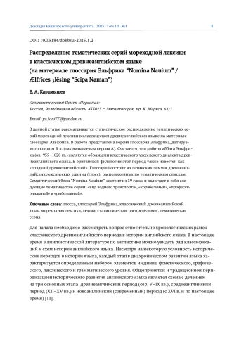 В данной статье рассматривается статистическое распределение тематических серий мореходной лексики в классическом древнеанглийском языке на материале глоссария Эльфрика. В работе представлена версия глоссария Эльфрика, датируемого концом X в. (так называемая версия А). Считается, что работы аббата Эльфрика (ок. 955-1020 гг.) являются образцами классического уэссекского диалекта древнеанглийского языка. В британской филологии этот период также известен как«поздний древнеанглийский». Глоссарий состоит из латинских лемм и древнеанглийских лексических единиц (глосс), расположенных по тематическим спискам. Семантический блок “Nomina Nauium” состоит из 39 глосс и включает в себя следующие тематические серии: «вид водного транспорта», «корабельный», «профессиональный» и «рыболовный».