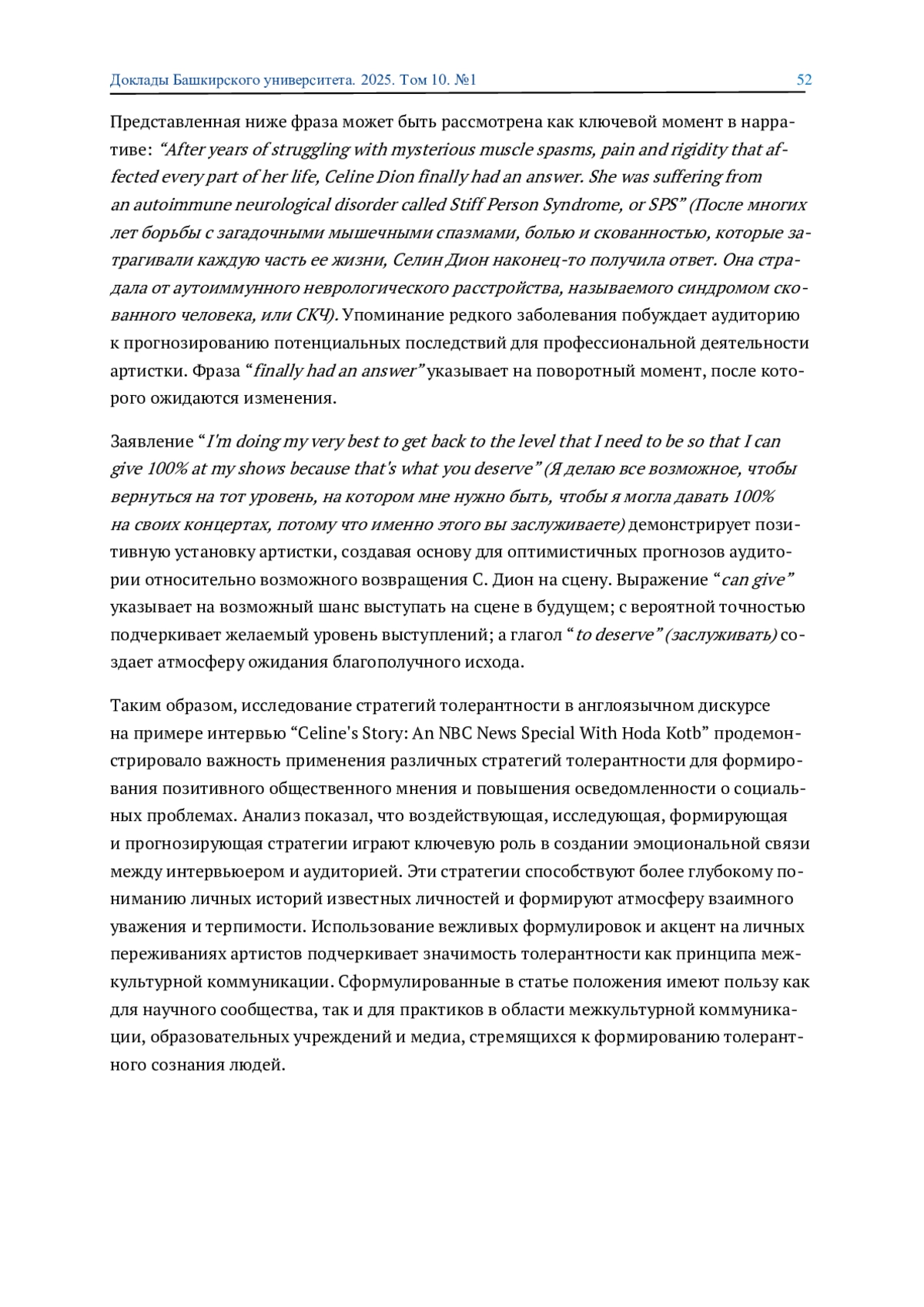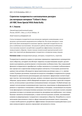 Статья посвящена толерантности как ключевому принципу коммуникации, исследуемому в англоязычном академическом сообществе. На основе интервью с певицей Селин Дион анализируются языковые приемы стратегий толерантности и их роль в публичных выступлениях. Актуальность работы обусловлена необходимостью изучения языкового воздействия и разработки эффективных механизмов межкультурного общения. Анализ показал значительный прагматический потенциал этих стратегий для формирования толерантного отношения между людьми.