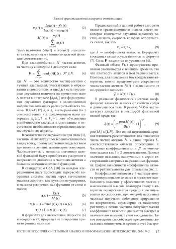 Для гравитационных алгоритмов поиска (GSA) исходным физическим механизмом служит образование плотных тел во вселенной за счёт гравитационного притяжения частиц [7]. Они обладают наглядностью и удобны для программной реализации. В них данным сопоставляют отдельные частицы в многомерном пространстве, испытывающие условное взаимное притяжение подобное притяжению масс, значение которых зависит от величины целевой функции. GSA дают возможность решать сложные задачи глобальной оптимизации [8–11] и нашли различные приложения [12–15]. Несмотря на существенное удобство применения GSA, им присущи определённые недостатки, связанные с использованием уравнений в виде законов Ньютона с консервативными силами. Уже в исходной физической формулировке они приводят к нежелательным эффектам потери точности за счёт инерции движения, так как перемещение частиц продолжается и после прекращения действия сил.
