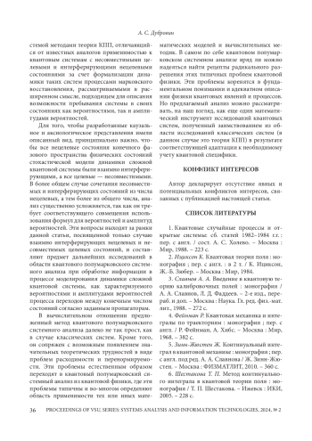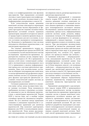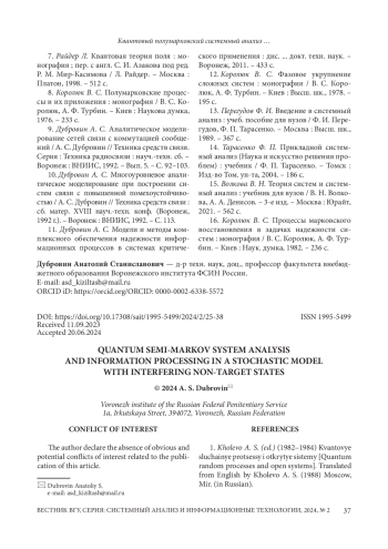 ДУБРОВИН А. С. КВАНТОВЫЙ ПОЛУМАРКОВСКИЙ СИСТЕМНЫЙ АНАЛИЗ И ОБРАБОТКА ИНФОРМАЦИИ В СТОХАСТИЧЕСКОЙ МОДЕЛИ С ИНТЕРФЕРИРУЮЩИМИ НЕЦЕЛЕВЫМИ СОСТОЯНИЯМИ // ВЕСТНИК ВОРОНЕЖСКОГО ГОСУДАРСТВЕННОГО УНИВЕРСИТЕТА. СЕРИЯ: СИСТЕМНЫЙ АНАЛИЗ И ИНФОРМАЦИОННЫЕ ТЕХНОЛОГИИ. 2024. № 2