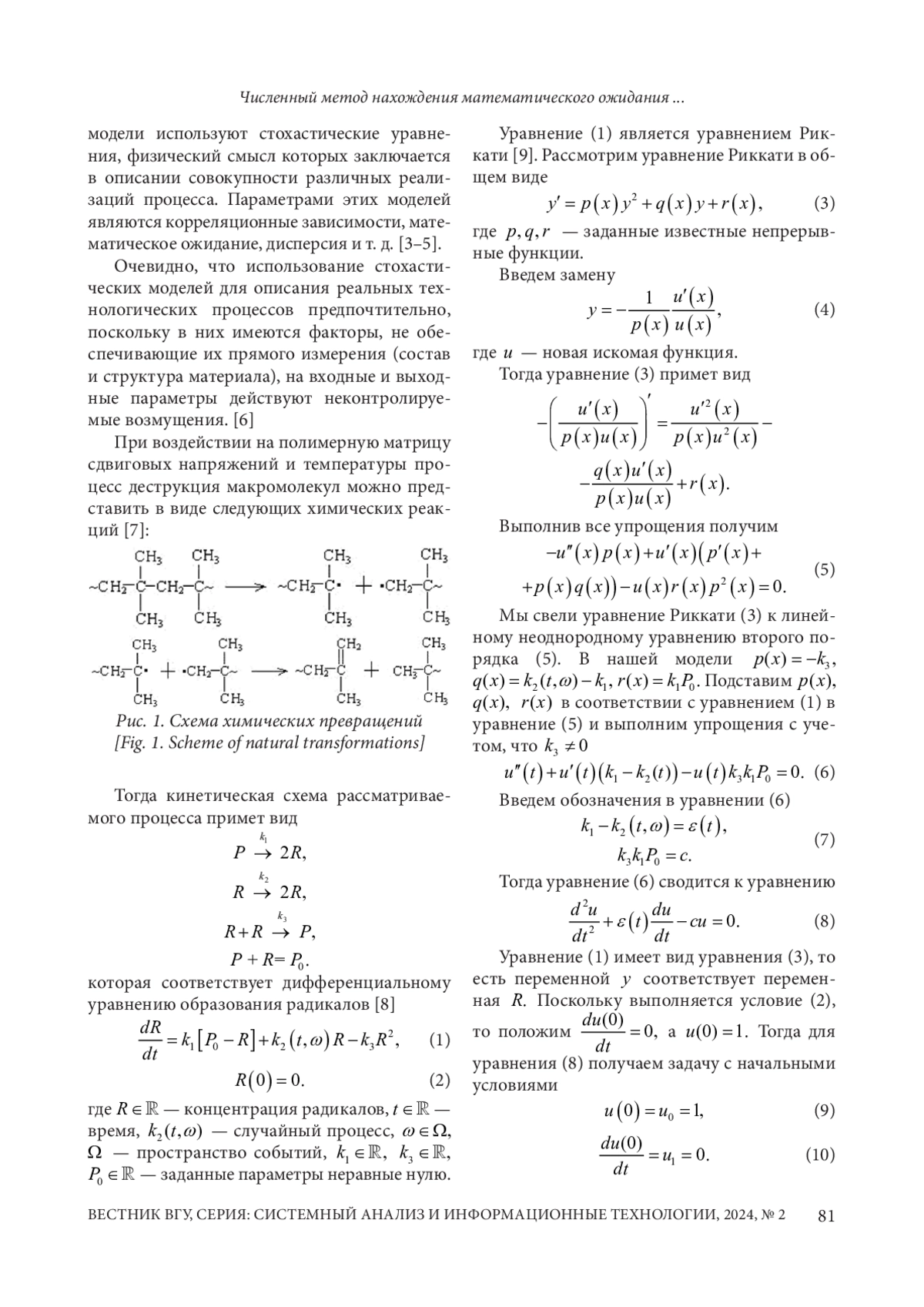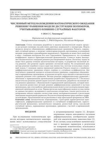 Статья посвящена разработке и анализу математической модели процесса деструкции полимера под действием сдвиговых напряжений и температуры. Модель процесса является обыкновенным дифференциальным уравнением Риккати, содержащей случайный процесс, и включает элементарные реакции, протекающие в полимерной матрице: разрушение и рекомбинация макромолекул. Уравнение не может быть записано в виде с помощью интегралов Ито или Стратоновича. Предполагается, что случайный коэффициент задается характеристическим функционалом. Ставится задача нахождения математического ожидания решения рассматриваемой модели. Поскольку задача не может быть решена точными аналитическими методами, то разработан численный метод решения. Для решения задачи применен системный подход. На сегодняшний день методы решения подобного класса задач нам неизвестны, поэтому использован следующий подход. С помощью замены переменной уравнение Риккати сводится к линейному дифференциальному уравнению второго порядка со случайным коэффициентом. Для полученного уравнения находится вспомогательное уравнение, содержащее обыкновенные и вариационные производные, из решения которого легко находится математическое ожидание решения этого уравнения. Методы решения дифференциальных уравнений с обычными и вариационными производными разработаны Задорожним В. Г. Поскольку аналитическое решение данной задачи получить невозможно, разработан численный метод решения уравнения с обыкновенной и вариационной производными, который является аналогом разностных методов решения дифференциальных уравнений в частных производных, при этом наиболее принципиальным является метод аппроксимации вариационной производной на сетке. Параметрическая идентификация модели осуществлена по данным натурного эксперимента генетическим алгоритмом. Анализ результатов моделирования показал хорошее соответствие между экспериментальными и расчетными значениями концентрации радикалов. Результаты моделирования представлены в графической форме. Предложенный метод реализован в виде прикладной программы на ЭВМ.