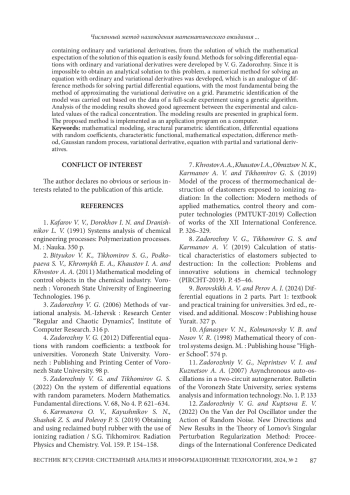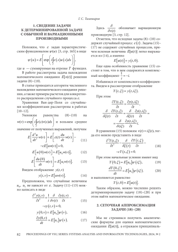 Ключевые фразы: математическое моделирование, структурная параметрическая идентификация, дифференциальные уравнения со случайными коэффициентами, характеристический функционал, математическое ожидание, разностный метод, гауссовский случайный процесс, вариационная производная, уравнение с частной и вариационной производными
