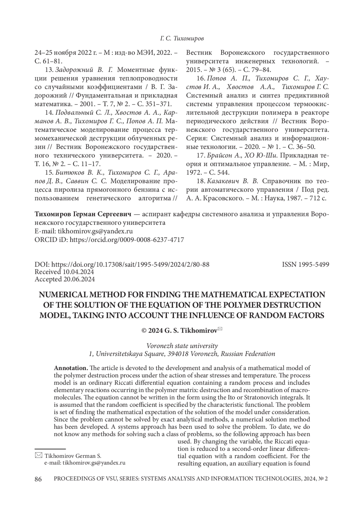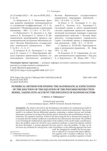ТИХОМИРОВ Г. С. ЧИСЛЕННЫЙ МЕТОД НАХОЖДЕНИЯ МАТЕМАТИЧЕСКОГО ОЖИДАНИЯ РЕШЕНИЯ ЗАДАЧИ КОШИ ДЛЯ ДИФФЕРЕНЦИАЛЬНОГО УРАВНЕНИЯ СО СЛУЧАЙНЫМ ПРОЦЕССОМ // ВЕСТНИК ВОРОНЕЖСКОГО ГОСУДАРСТВЕННОГО УНИВЕРСИТЕТА. СЕРИЯ: СИСТЕМНЫЙ АНАЛИЗ И ИНФОРМАЦИОННЫЕ ТЕХНОЛОГИИ. 2024. № 2