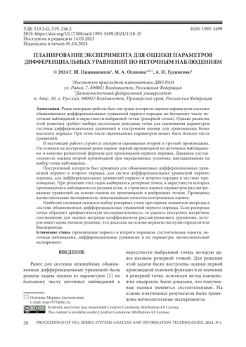 1. Цициашвили Г. Ш. Оценка параметров дифференциальных уравнений по неточным наблюдениям / Г. Ш. Цициашвили, М. А. Осипова // Вестник Воронежского ГУ серия: Системный анализ и информационные технологии. - 2022. - № 2. - С. 51-74.