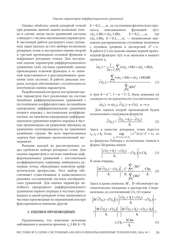 Ранее авторами работы был построен алгоритм оценки параметров системы обыкновенных дифференциальных уравнений первого порядка по большому числу неточных наблюдений в окрестности выбранной точки (реперной точки). Однако развитие этой тематики требует выбора нескольких реперных точек для оценивания параметров системы дифференциальных уравнений и построения оценок для производных более высокого порядка. При этом число оцениваемых параметров может быть больше числа уравнений. В настоящей работе строится алгоритм оценивания второй и третьей производных. Он основан на построенной ранее оценке первой производной по неточным наблюдениям и конечно разностной формуле для производной первого порядка. Доказана состоятельность оценки второй производной при определенных условиях, накладываемых на выбор точек наблюдения. Построенный алгоритм был применен для обыкновенных дифференциальных уравнений первого и второго порядка, для систем дифференциальных уравнений первого порядка, для дифференциальных уравнений первого и второго порядка в частных производных. При решении этих задач выбирались реперные точки, в окрестности которых производились наблюдения по разным осям, и строились оценки параметров рассматриваемых уравнений на основе оценок их производных в выбранных точках. Проведены вычислительные эксперименты, показывающие качество построенных оценок. Наиболее сложным оказался выбор реперных точек при оценке элементов матрицы в системе обыкновенных дифференциальных уравнений первого порядка. Если реперные точки образуют арифметическую последовательность, то удалось построить матричное соотношение для оценки матрицы коэффициентов рассматриваемого уравнения, которое имеет единственное решение, что доказано на основе неравенства нулю определителя Вандермонда.