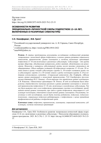 В статье представлены результаты исследования особенностей развития эмоционально- личностной сферы подростков, а именно уровень развития социального интеллекта, тревожности, уровня самооценки и системы жизненных ориентаций подростков 12-16 лет включенных в различные субкультуры. Субкультура - это группа внутри общества, объединенная интересами, родом занятий, убеждениями или ценностями. Ценности и интересы субкультурной группы могут заметно отличаться от общепринятых. Объем выборки составили 40 подростков в возрасте 12-16 лет: 20 человек вошли в группу «онлайн субкультуры» (группа 1), 10 человек составили группу «не в субкультурах» (группа 2) и 10 человек вошли в группу косплееров (группа 3). В исследовании использовались методики: «Социальный интеллект» Дж. Гилфорда, «Шкала оценки уровня реактивной и личностной тревожности» Ч. Д. Спилбергерга (русскоязычная адаптация Ю. Л. Ханина), «Тест-опросник для определения уровня самооценки» С. В. Ковалева, «Ценностные ориентации» М. Рокича. В ходе исследования были обнаружены статистически значимые различия в уровне развития самооценки и личностной тревожности подростков 12-16 лет, включенных в молодежные субкультуры. Так же было выявлено что у всех подростков, принимавших участие в исследовании, преобладает низкий уровень самооценки, при этом в группе подростков, относящихся к субкультуре косплеееров, отмечается самый низкий уровень самооценки. Результаты, полученные в ходе исследования, могут быть полезны родителям, педагогам, педагогам-психологам, социальным педагогам работающими с подростками с целью проведения профилактической работы в подростковой среде.