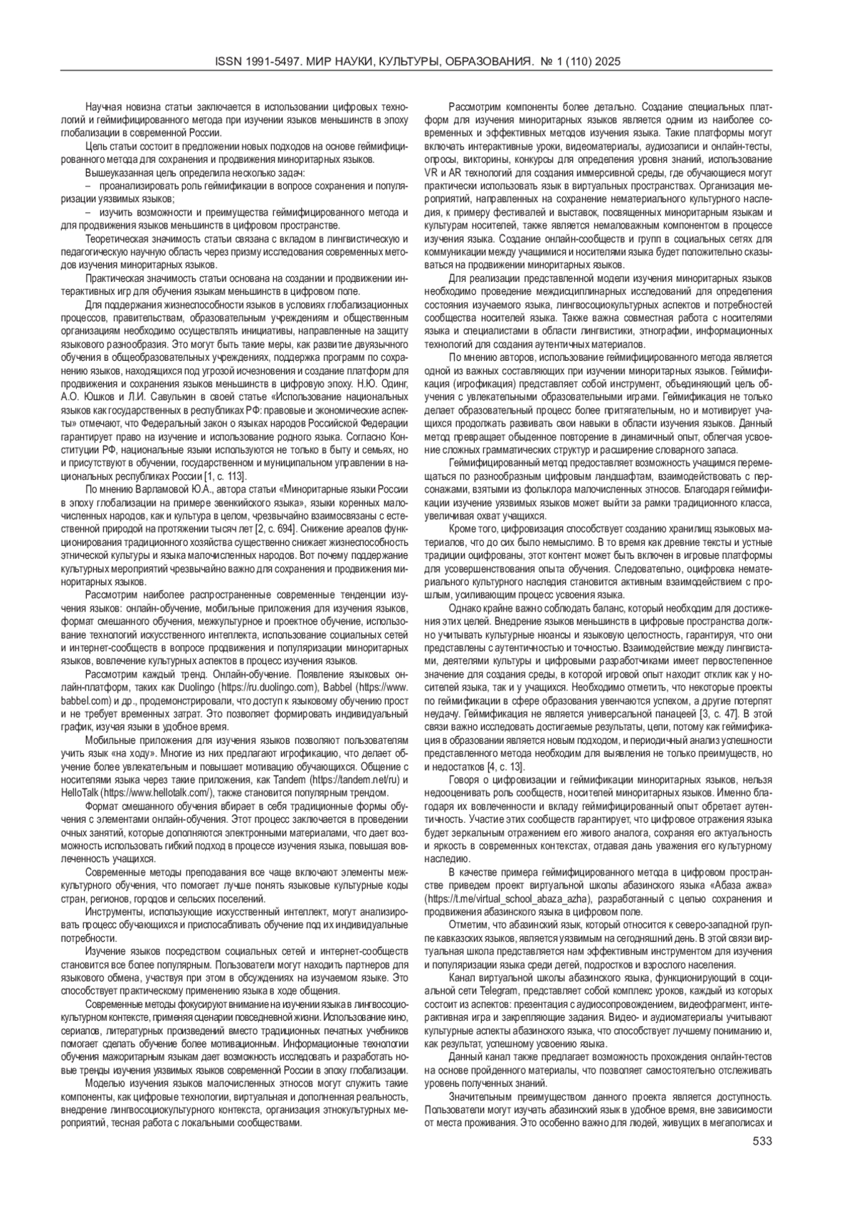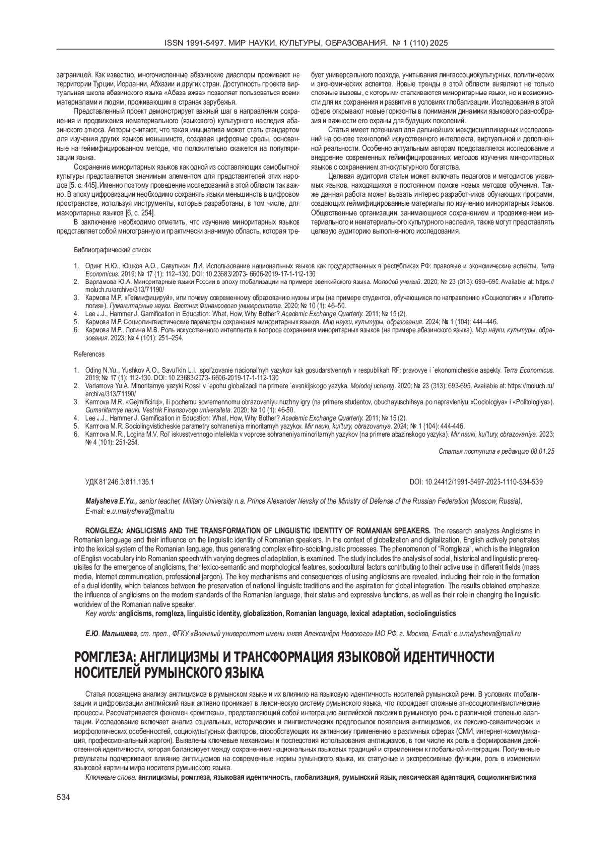Статья: НОВЫЕ ТЕНДЕНЦИИ ИЗУЧЕНИЯ МИНОРИТАРНЫХ ЯЗЫКОВ В СОВРЕМЕННОЙ РОССИИ В ЭПОХУ ГЛОБАЛИЗАЦИИ: ГЕЙМИФИЦИРОВАННЫЙ МЕТОД (2025)