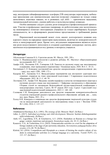 3. Акифи О.И., Легочкина Е.Н., Гончарова А.В. Хакатон по русскому языку как иностранному: содержание, опыт проведения и перспективы // Казанская наука. 2024. № 4. С. 18-21.