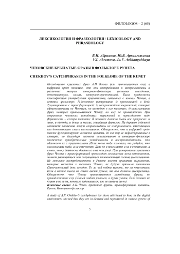 Исследование крылатых фраз А. П. Чехова (или приписываемых ему) в цифровой среде показало, что они востребованы и воспроизводимы в различных жанрах интернет-фольклора (сетевых анекдотах, демотиваторах, мемах, интернет-презентемах). Была предложена классификация употребления крылатизмов, связанных с именем Чехова, в сетевом фольклоре: 1) дословное цитирование (с креолизацией и без); 2) цитирование с трансформацией; 3) воспроизведение выражений, которые сформулированы не Чеховым, но восходят к его текстам; 4) использование фраз, которые приписываются Чехову, но ему не принадлежат. При сохранении чеховских устойчивых выражений в первозданном виде (Краткость - сестра таланта; В человеке должно быть все прекрасно: и лицо, и одежда, и душа, и мысли; лошадиная фамилия; На деревню дедушке) создатели контента могут сопровождать их изображением, изменяющим или дополняющим смысл высказывания. Обнаружено, что в цифровой среде также функционируют чеховские цитаты, до сих пор не зафиксированные в словарях, но благодаря частому использованию в интернет-фольклоре постепенно приобретающие устойчивость и воспроизводимость, что сближает их с крылатизмами (Если жена тебе изменила, то радуйся, что она изменила тебе, а не отечеству; Дело не в пессимизме и не в оптимизме, а в том, что у девяноста девяти из ста нет ума). При цитировании крылатых фраз Чехова с трансформацией происходит лексическая мена компонентов, может расширяться или сокращаться компонентный состав высказывания. Не меньшую востребованность в Рунете имеют крылатые выражения, которые восходят к текстам Чехова, не будучи прямыми цитатами (Замечательный день сегодня. То ли чай пойти выпить, то ли повеситься; Если в начале пьесы на стене висит ружье, то оно должно выстрелить). Обнаружено, что Чехову приписываются устойчивые фразы, не принадлежащие ему (Умный любит учиться, а дурак учить; Если человек не курит и не пьет, поневоле задумаешься, уж не сволочь ли он).