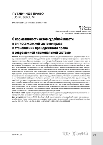 Анализируется содержание принципа stare decisis, выдвигаются основные аргументы в его пользу, рассматривается система прецедентного права, исследуются тенденции ее внедрения в российскую правовую систему. Сделаны выводы о том, что судебный прецедент, сыгравший историческую роль в формировании и развитии правовых систем общего права, постепенно меняет свое положение в системе источников. Установлено, что в англосаксонской правовой доктрине вопрос прецедента сейчас не является однозначным. Указано на отсутствие судебной политики в вопросе отмены прецедентов и доказывается, что призывы ученых отказаться от принципа stare decisis в сфере конституционного права небезосновательны. Установлено, что, несмотря на отрицание в российской правовой доктрине судебного прецедента и дискуссионность данного вопроса, в России судебный прецедент был мягко интегрирован в национальную правовую систему в форме прецедента толкования, что носит концептуальный характер и влечет за собой необходимость трансформации всей системы законодательства. Сделан вывод, что судебный прецедент не совпадает с актом судебной власти, а является лишь порядком мотивации этого акта, приобретающим обязательную силу при соблюдении судом этого порядка мотивации по аналогичным делам, и как источник права придает нормативную силу тем актам судебной власти, где он содержится. Отмечено, что не является верным полное отделение судебного прецедента от судебного решения, в котором он содержится, поскольку судебный прецедент привязан к фактическим обстоятельствам дела, изложенным в соответствующей части судебного решения.