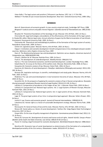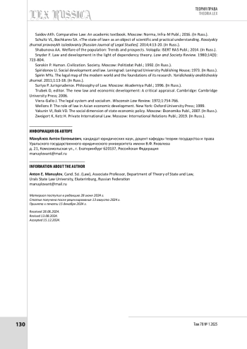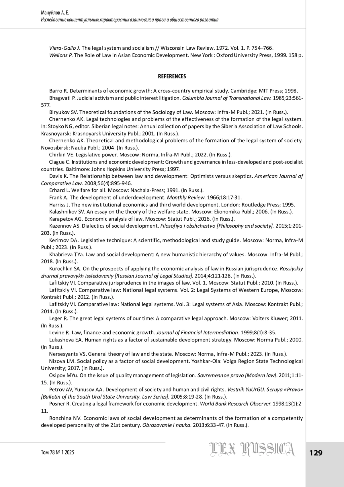 МАНУЙЛОВ А. Е. ИССЛЕДОВАНИЕ КОНЦЕПТУАЛЬНЫХ ХАРАКТЕРИСТИК ВЗАИМОСВЯЗИ ПРАВА И ОБЩЕСТВЕННОГО РАЗВИТИЯ // LEX RUSSICA (РУССКИЙ ЗАКОН). 2025. ТОМ 78, № 1