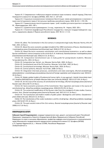 9. Чиркин В. Е. О социоэкономической парадигме (модели) Конституции России 1993 года // Конституционное и муниципальное право. 2018. № 12. С. 27-32.