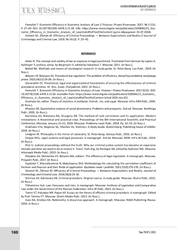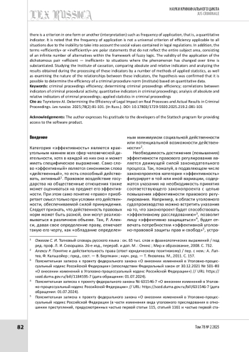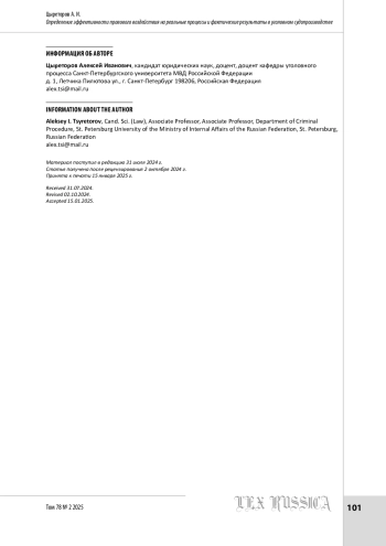 ЦЫРЕТОРОВ А. И. ОПРЕДЕЛЕНИЕ ЭФФЕКТИВНОСТИ ПРАВОВОГО ВОЗДЕЙСТВИЯ НА РЕАЛЬНЫЕ ПРОЦЕССЫ И ФАКТИЧЕСКИЕ РЕЗУЛЬТАТЫ В УГОЛОВНОМ СУДОПРОИЗВОДСТВЕ // LEX RUSSICA (РУССКИЙ ЗАКОН). 2025. ТОМ 78, № 2
