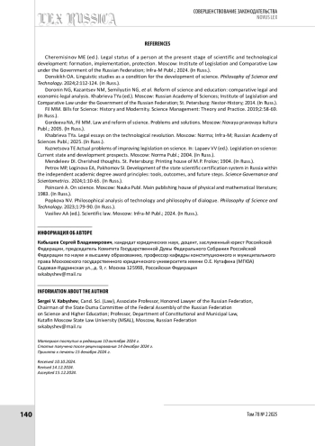 Наука и научно-технологическое развитие являются сегодня ключевым фактором обеспечения суверенитета, безопасности и благополучия государства, создания условий для достойной жизни граждан. С учетом стоящих перед страной исторических вызовов, преодолеть которые возможно только путем мобилизации интеллектуального и ресурсного потенциала страны, необходимо сфокусироваться на поиске подходов и решений, которые позволили бы максимально задействовать ресурсы права для стимулирования научного прогресса, устранить накопившиеся регулятивные факторы его торможения. Это предполагает не просто актуализацию, а переход к новому уровню качества законодательства о науке, его интеграцию и социальную ориентацию через придание закону о науке качеств системообразующего непосредственного регулятора соответствующих отношений в целях достижения общественно значимого эффекта. В статье, призванной оживить и структурировать дискуссию относительно перспектив развития законодательства о науке, ставятся на обсуждение некоторые основные, на взгляд автора — концептуальные, вопросы, в том числе о смысле и пределах нормативно-правового воздействия в сфере науки, в частности в соотношении с иными социальными регуляторами, о предметной, методологической, структурной специфике регулирования соответствующих отношений, организационно-управленческих, финансовых и иных составляющих государственной политики в области науки и научно-технологического развития.
