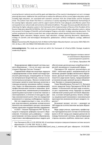 ЖАВОРОНКОВА Н. Г., ШПАКОВСКИЙ Ю. Г. К ВОПРОСУ О РЕФОРМЕ СИСТЕМЫ ВЫСШЕГО ОБРАЗОВАНИЯ // LEX RUSSICA (РУССКИЙ ЗАКОН). 2025. ТОМ 78, № 2