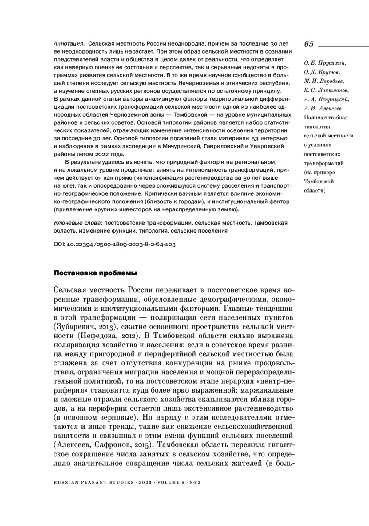 Сельская местность России неоднородна, причем за последние 30 лет ее неоднородность лишь нарастает. При этом образ сельской местности в сознании представителей власти и общества в целом далек от реальности, что определяет как неверную оценку ее состояния и перспектив, так и серьезные недочеты в программах развития сельской местности. В то же время научное сообщество в большей степени исследует сельскую местность Нечерноземья и этнических республик, а изучение степных русских регионов осуществляется по остаточному принципу. В рамках данной статьи авторы анализируют факторы территориальной дифференциации постсоветских трансформаций сельской местности одной из наиболее однородных областей Черноземной зоны - Тамбовской - на уровне муниципальных районов и сельских советов. Основой типологии районов является набор статистических показателей, отражающих изменение интенсивности освоения территории за последние 30 лет. Основой типологии поселений стали материалы 53 интервью и наблюдения в рамках экспедиции в Мичуринский, Гавриловский и Уваровский районы летом 2022 года. В результате удалось выяснить, что природный фактор и на региональном, и на локальном уровне продолжает влиять на интенсивность трансформаций, причем действует он как прямо (интенсификация растениеводства за 30 лет выше на юге), так и опосредованно через сложившуюся систему расселения и транспортно-географическое положение. Критически важным является влияние экономико-географического положения (близость к городам), и институциональный фактор (привлечение крупных инвесторов на нераспределенную землю).