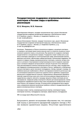 Появившись в России относительно недавно, концепция кластерного подхода в настоящее время заняла важное место в стратегии социально-экономического развития страны и ее регионов. Ряд проектов по созданию кластеров осуществляется в инициативном порядке. Государство играет особую роль в развитии кластеров, формируя их институциональную среду, организовывая взаимодействие участников, обеспечивая инфраструктурную и финансовую поддержку. Это касается в первую очередь агропромышленных кластеров, значение которых возросло в условиях стимулирования импортозамещения после пандемии коронавируса и активного введения антироссийских санкций. В данной статье обзорного типа рассматриваются понятие агропромышленного кластера, меры государственной поддержки агропромышленных кластеров в России, требования к агропромышленным кластерам в целях получения господдержки. Авторы приходят к выводу, что наиболее важными проблемами в области исследования являются длительные сроки согласования решений на различных уровнях власти; проблемы координации деятельности государственных органов и общественных объединений предпринимателей; недостаточные сроки для отчета об использовании предоставленных государственных средств; неясность процедур процесса отбора кластеров для финансирования, неверный выбор кластерного объекта для финансирования; слепое копирование зарубежной практики без учета специфических особенностей экономики России и ее аграрного сектора. По результатам исследования были предложены направления решения выявленных проблем в области государственной поддержки агропромышленных кластеров.