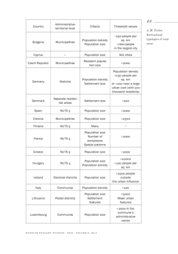 The article presents international, mainly European, typologies of rural areas, focusing on the features and differences in the criteria for identifying ‘rural’ territories in the European Union. The author explains the reasons for the need for more comprehensive typologies based on the transport accessibility of the territory, trajectories of its transformation, and macro-regional characteristics. The article considers the main methodological difficulties in developing a universal typology of rural areas for all regions of the world and emphasizes differences in the indicators and their threshold values used for typologies and in the levels of administrative-territorial analysis. The author provides references that reflect the methodological foundations of contemporary national typologies and mentions scientific innovations used in such research works. Finally, the article identifies the main common features of the presented typologies, focusing on their methodological limitations.