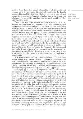 Methodology for the typologization of rural areas is of particular interest for rural geography due to the high diversity and heterogeneity of its object. Typologization can serve various research purposes: to monitor the development of ‘genetically’ identical rural areas, to improve the efficiency of rural and regional policies, to support spatial planning, and to scientifically identify distinctive features of regions/countries (Kotomina, 2019).