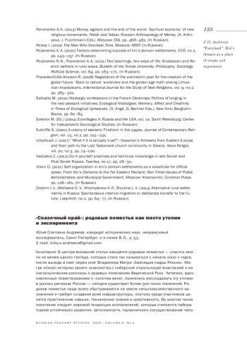 2. Andreeva J. O. (2012) Issues of power and self-government in the religious movement ‘Anastasia’: Ideal images of kin’s domain settlements and ideas of ‘dreams coming true’. Anthropological Forum, no 17, pp. 101-128. (In Russian).