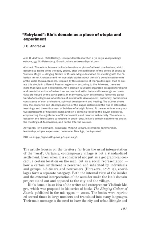 The article focuses on kin’s domains - plots of at least one hectare, which became so called since the early 2000s, after the publication of the series of books by Vladimir Megre - Ringing Cedars of Russia. Megre described his meeting with the Siberian hermit Anastasia and her nostalgic stories about the kin’s domain settlements of the Vedic Russia. Readers, inspired by this narrative of the ‘golden age’, tried to create this utopia in different Russian regions - according to the followers, there are more than 500 such settlements. Kin’s domain is usually organized on agricultural land and needs the entire infrastructure, so practical skills, technical knowledge and creativity are valued by the participants. In many ways, such settlements follow the global trend of ecovillages as laboratories of sustainable development, autonomy, harmonious coexistence of man and nature, spiritual development and healing. The author shows how the economic and ideological crisis of the 1990s determined the rise of alternative teachings and the enthusiasm of builders of a bright future. At the same time, many active participants of first ecovillages and kin’s domains followed the Soviet discourse, emphasizing the significance of Soviet morality and creative self-activity. The article is based on the field studies conducted in 2008-2021 in kin’s domain settlements and at the meetings of Anastasians, and on the Internet sources.