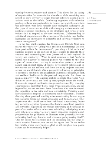 Рецензия на книгу: Скунс Я. (Ред.) (2023). Скотоводство, неопределенность и развитие, Регби: Изд-во «Практическое действие», 180 с. URL: https://practicalactionpublishing. com/ book/2667/pastoralism-uncertainty-and-development