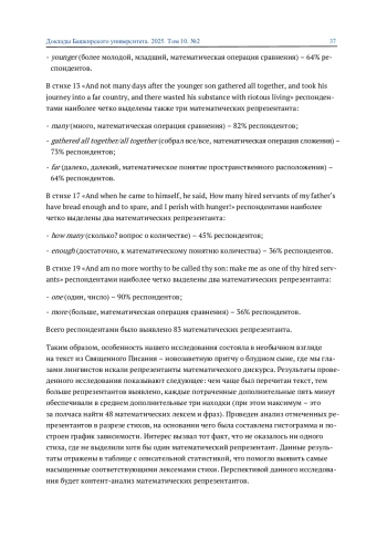 В статье приводятся результаты количественного исследования математических репрезентантов в англоязычном библейском тексте притчи о блудном сыне. Рассматривается суммарное количество отмеченных лексических единиц, а также времени, затраченного на их поиски, выводится зависимость. Анализируется распределение математических репрезентантов в разрезе стихов, составляется описательная статистика, делается вывод по наиболее насыщенным исследуемыми лексемами стихам. Исследованные лексемы относятся к математическим операциям сравнения, сложения, деления; понятиям числа, количества, части от целого, пространственного расположения.