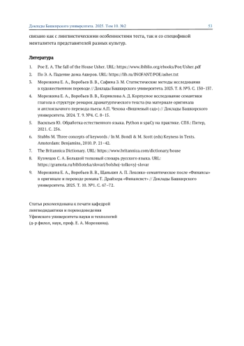 3. Морозкина Е. А., Воробьев В. В., Сафина З. М. Статистические методы исследования в художественном переводе // Доклады Башкирского университета. 2023. Т. 8. №3. С. 130-137. EDN: KHORTY