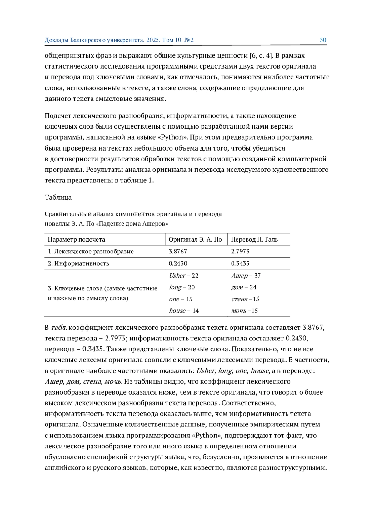 В работе проведено статистическое исследование оригинала и перевода новеллы Э. А. По «Падение дома Ашеров» с использованием программы, написанной на языке программирования «Python». В исследовании используются такие методы обработки естественного языка, как токенизация, лемматизация, что позволяет определить лексическое разнообразие и информативность текстов, а также выявить ключевые лексемы в текстах оригинала и перевода, определить полярность текста.