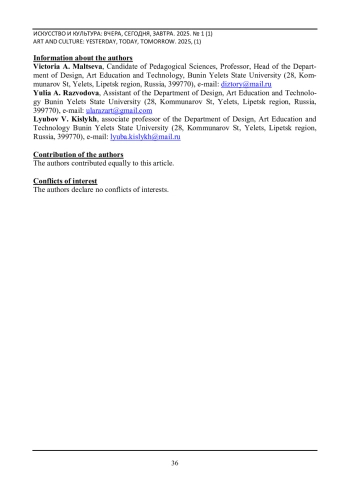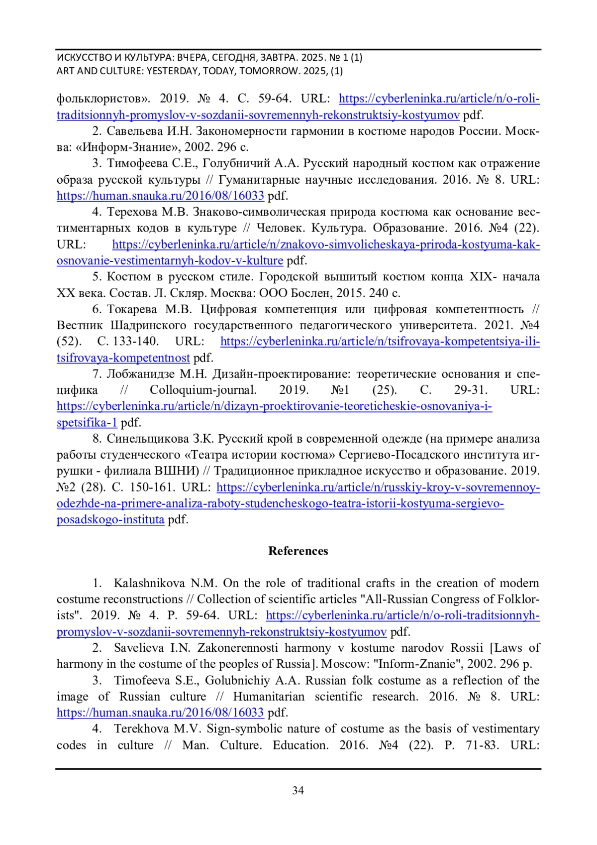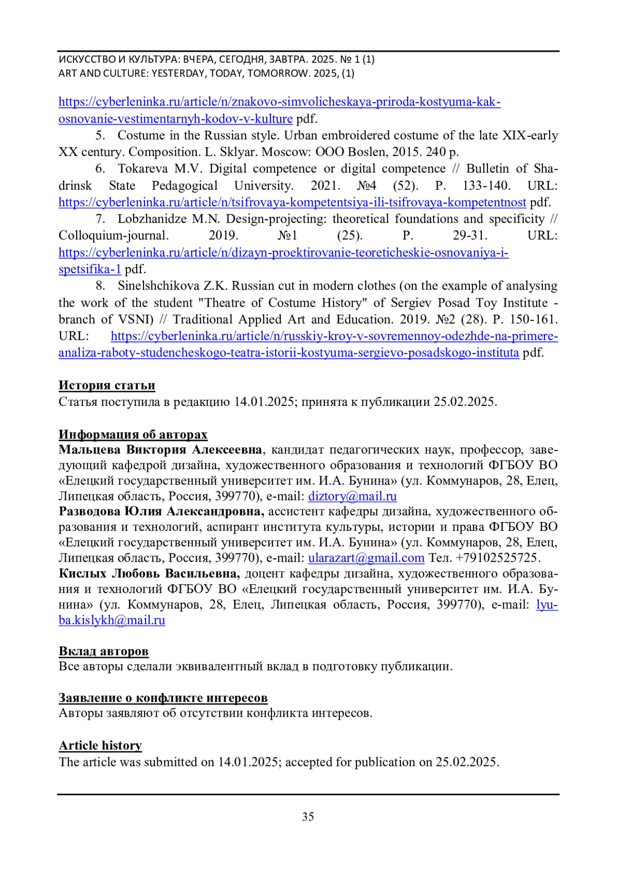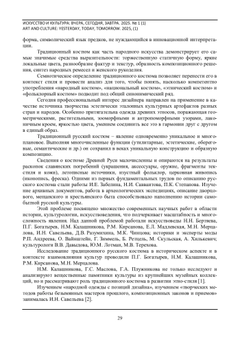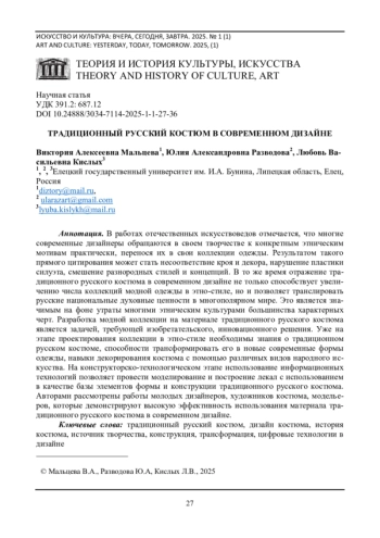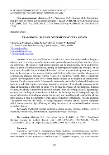 МАЛЬЦЕВА В. А., РАЗВОДОВА Ю. А., КИСЛЫХ Л. В. ТРАДИЦИОННЫЙ РУССКИЙ КОСТЮМ В СОВРЕМЕННОМ ДИЗАЙНЕ // ИСКУССТВО И КУЛЬТУРА: ВЧЕРА, СЕГОДНЯ, ЗАВТРА. 2025. № 1 (1)